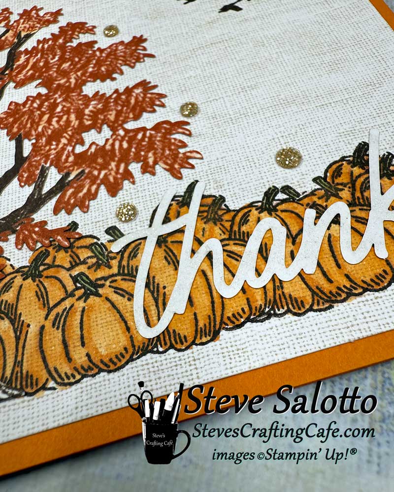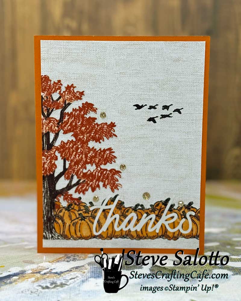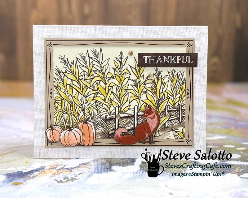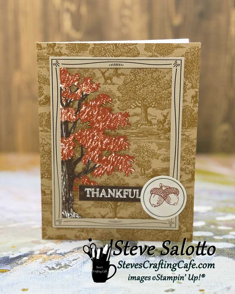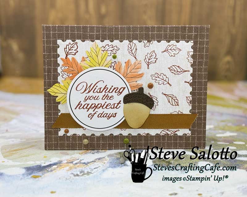 I die cut a panel using the "Perennial Postage" dies, stamped it with leaves, and added a die cut acorn from the add on.