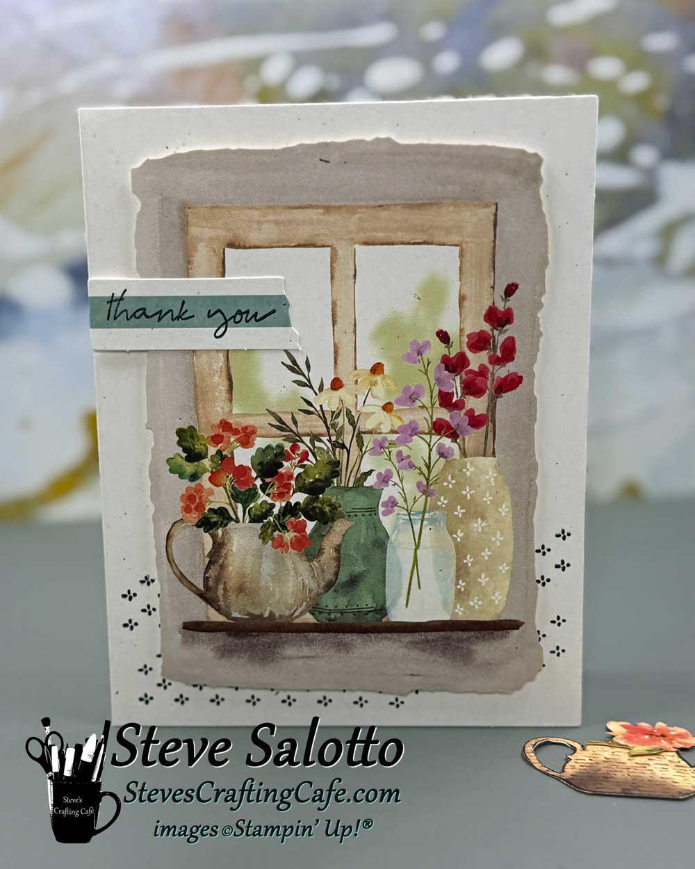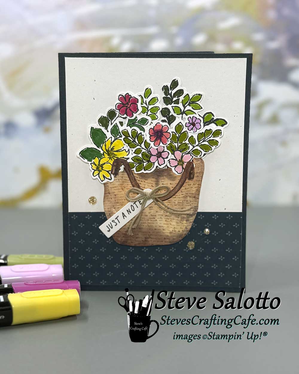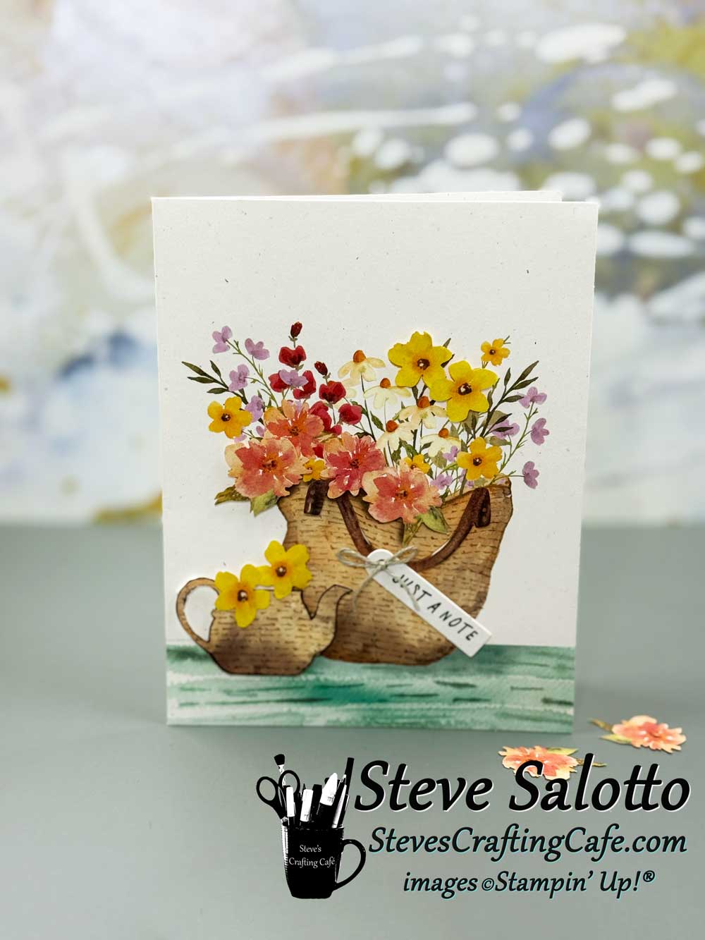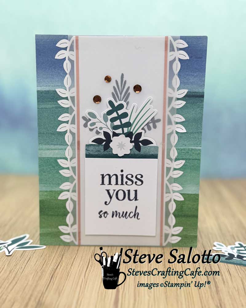 For this alternate, I added a trellis using the recently retired "Linked Together Dies." I turned the strawberry container into a pot and cut up one of the card fronts to use as a backing for my embossed sentiment.
