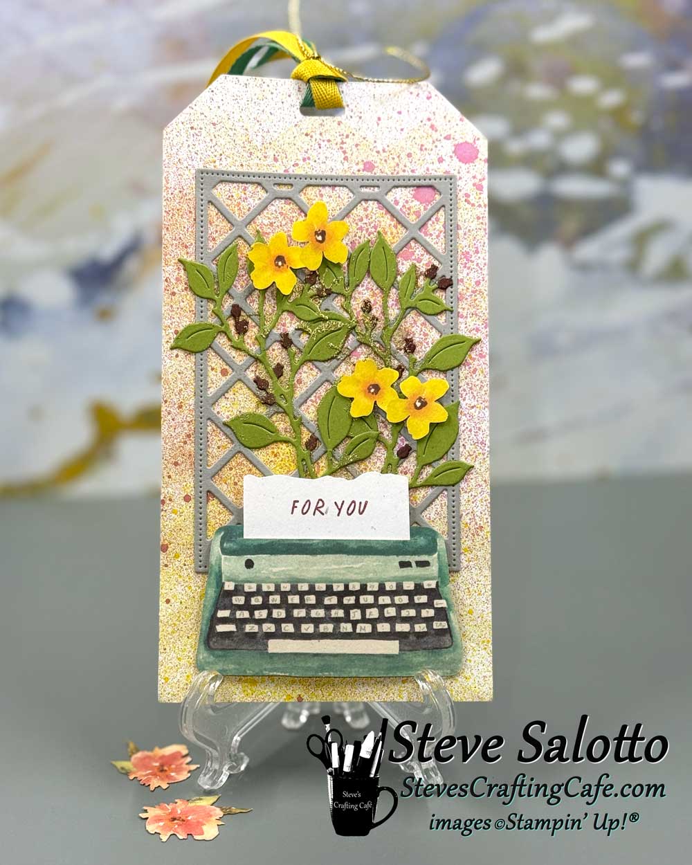 My tag for this month. I did some splattering on the background and added a trellis for fun.