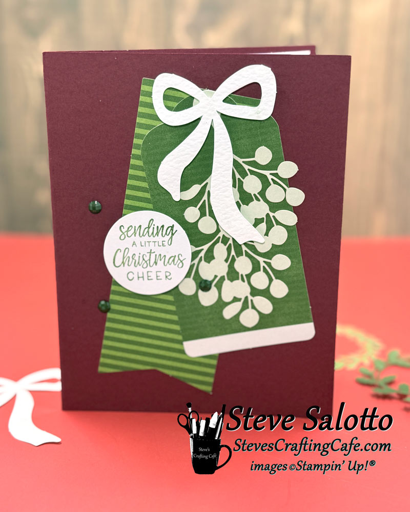 I matted a card front onto a piece of Blackberry Bliss card stock, then onto a Peach Pie card base. I colored a piece of Iridescent Trim with a Blackberry Bliss Stampin' Blend and tied it around the card.