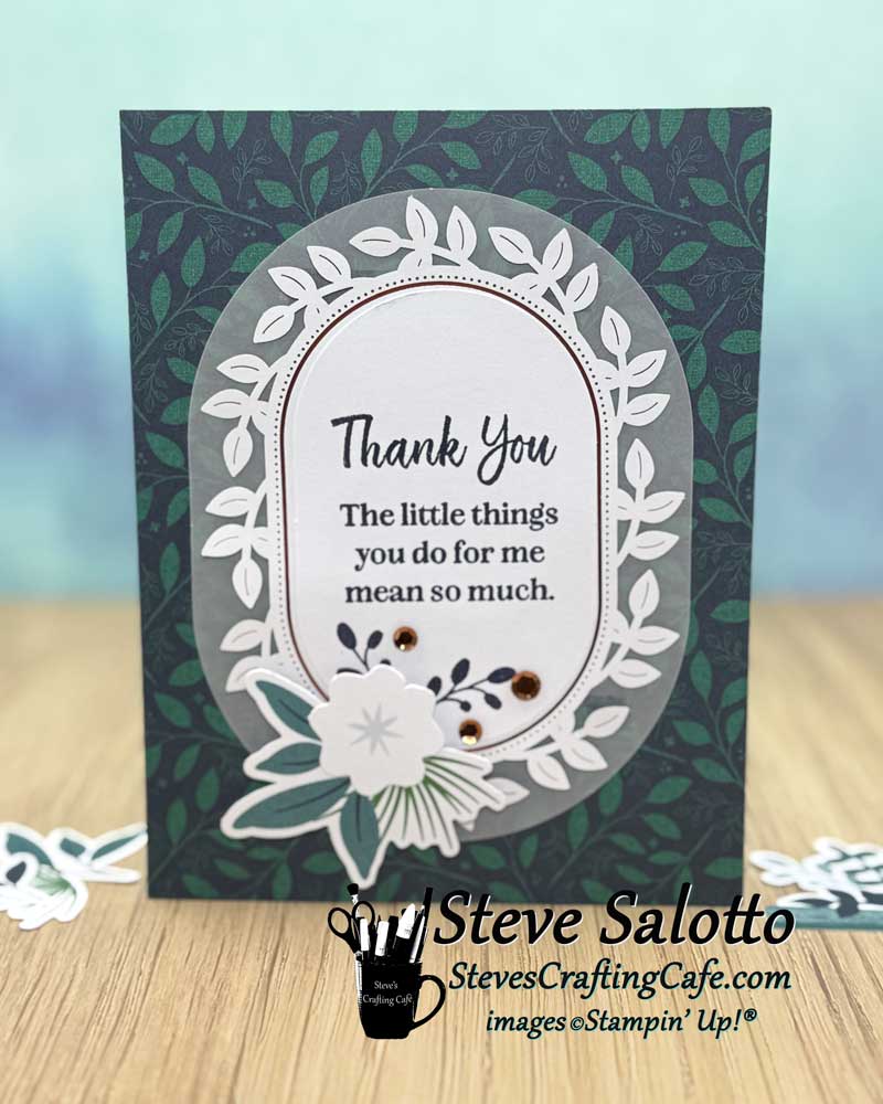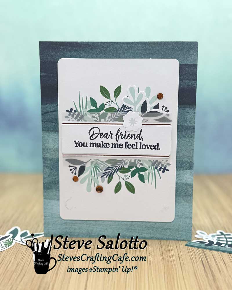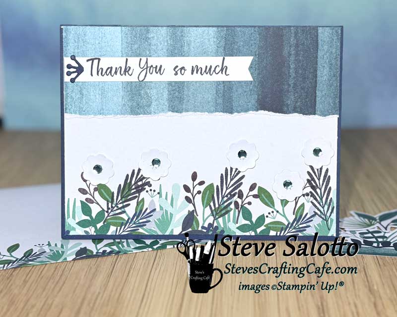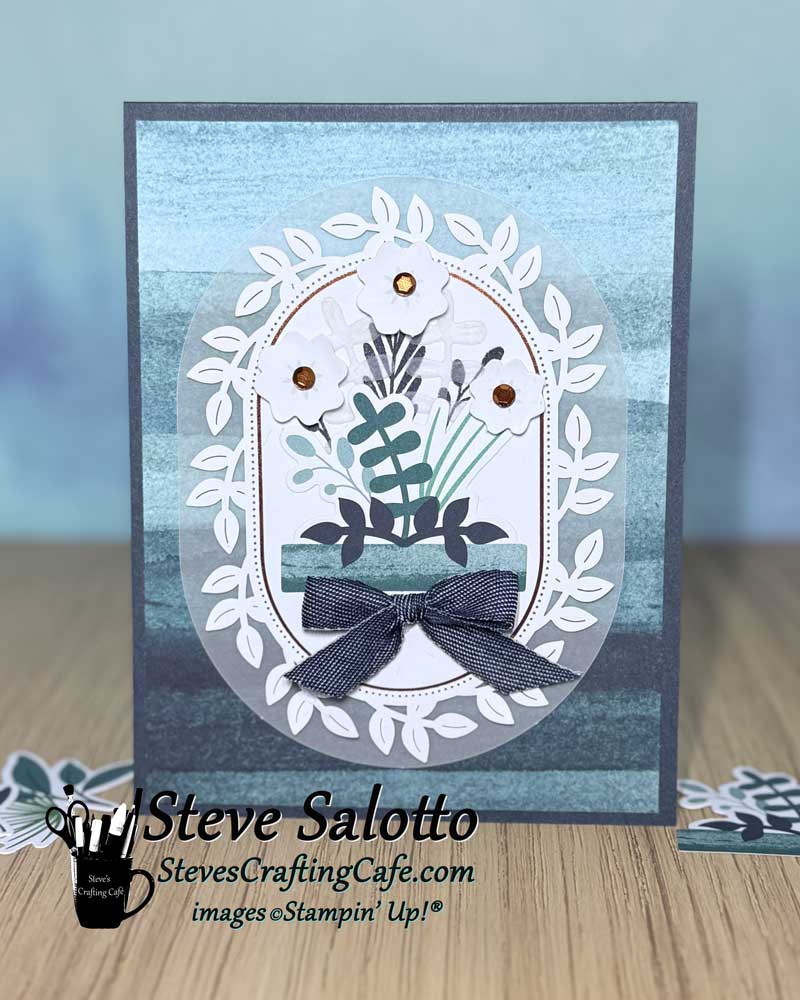 For this alternate, I matted the front of one of the base cards onto Secret Sea card stock and added some twine under the sentiment. Before I put the overlay on top of the flowers, I covered it with Wink of Stella so it sparkles like crazy.